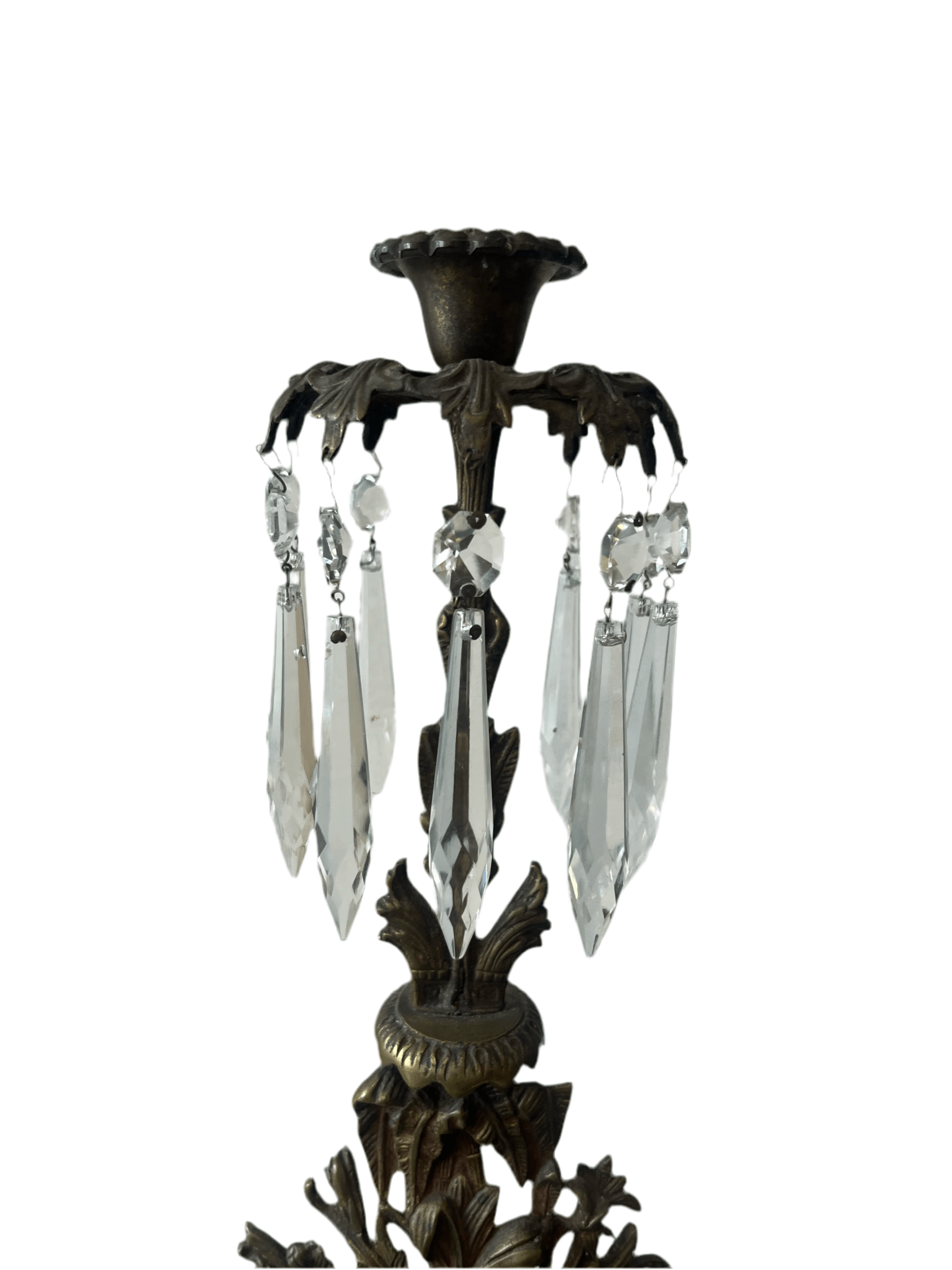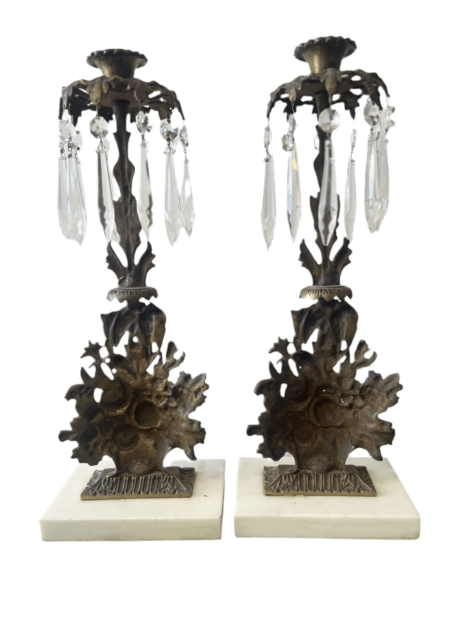 This antique 1800's candelabra set features delicate floral details and heavy metal construction.
