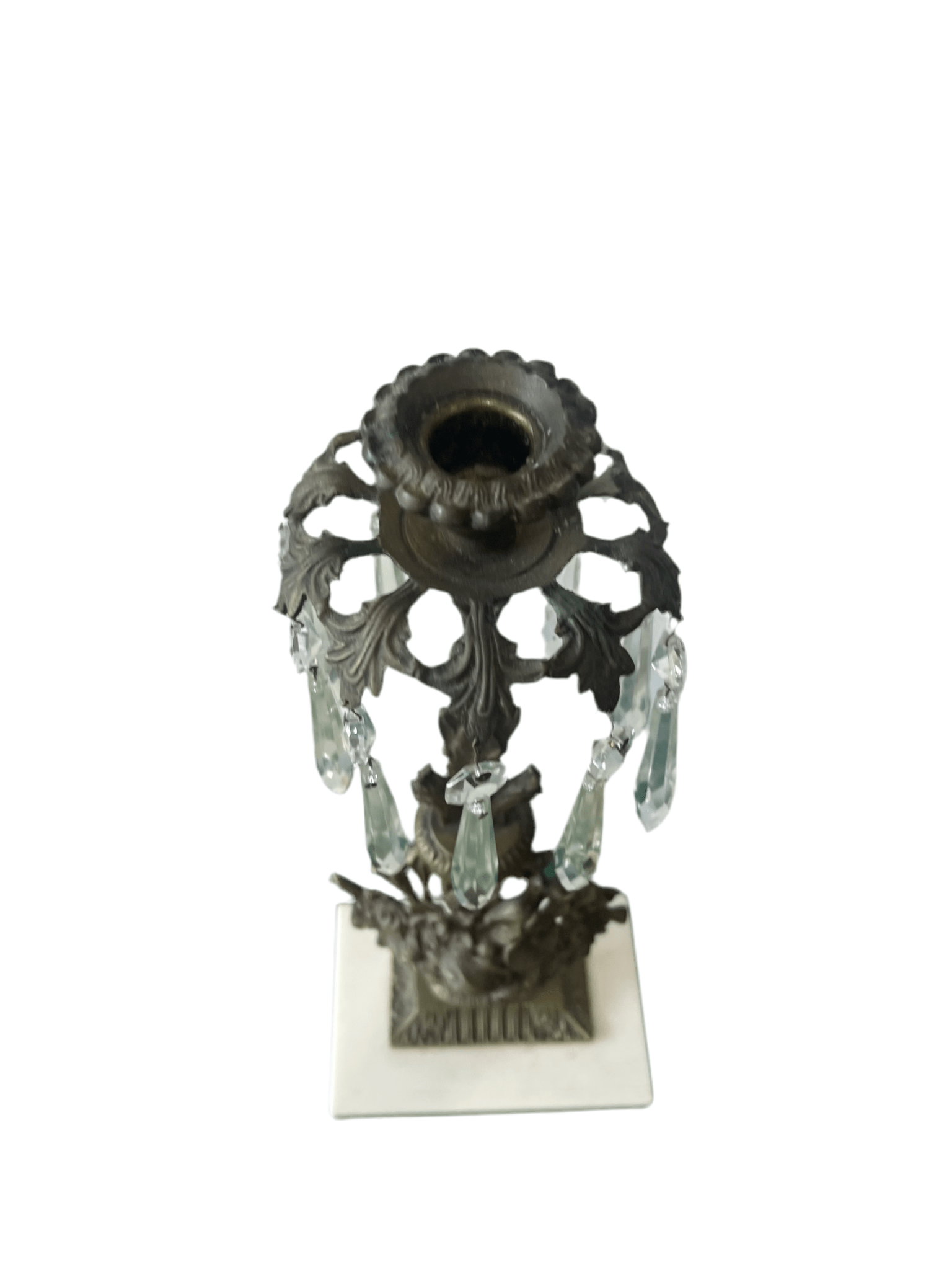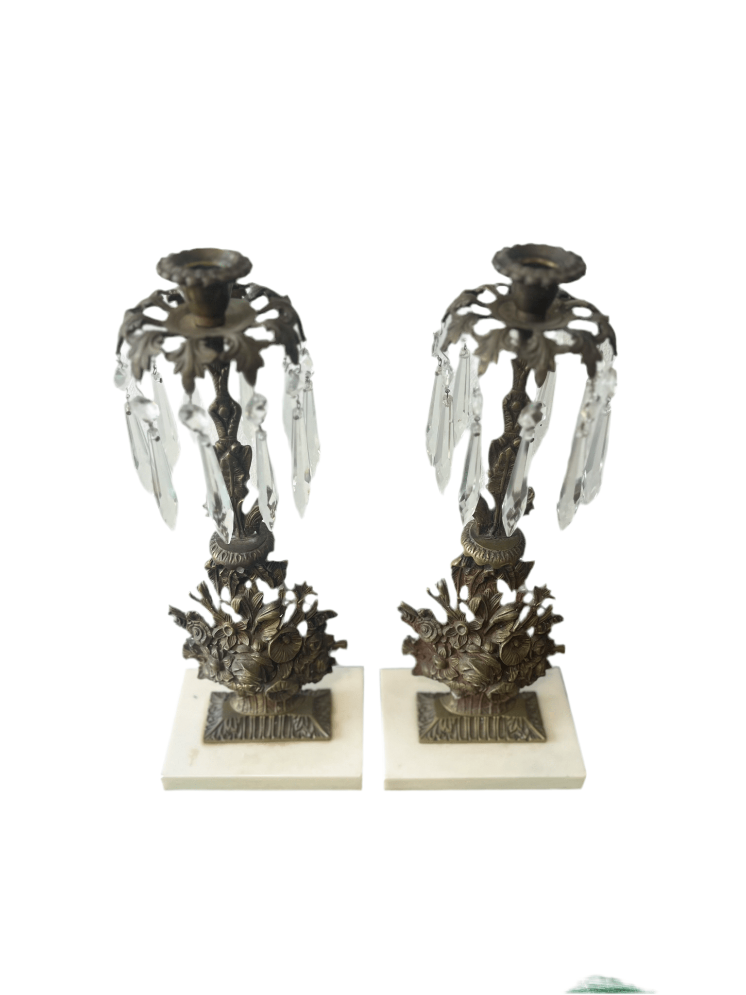 The Hollywood regency style candle holders boast a stunning marble base, with delicate crystals hanging from the top like a chandelier.