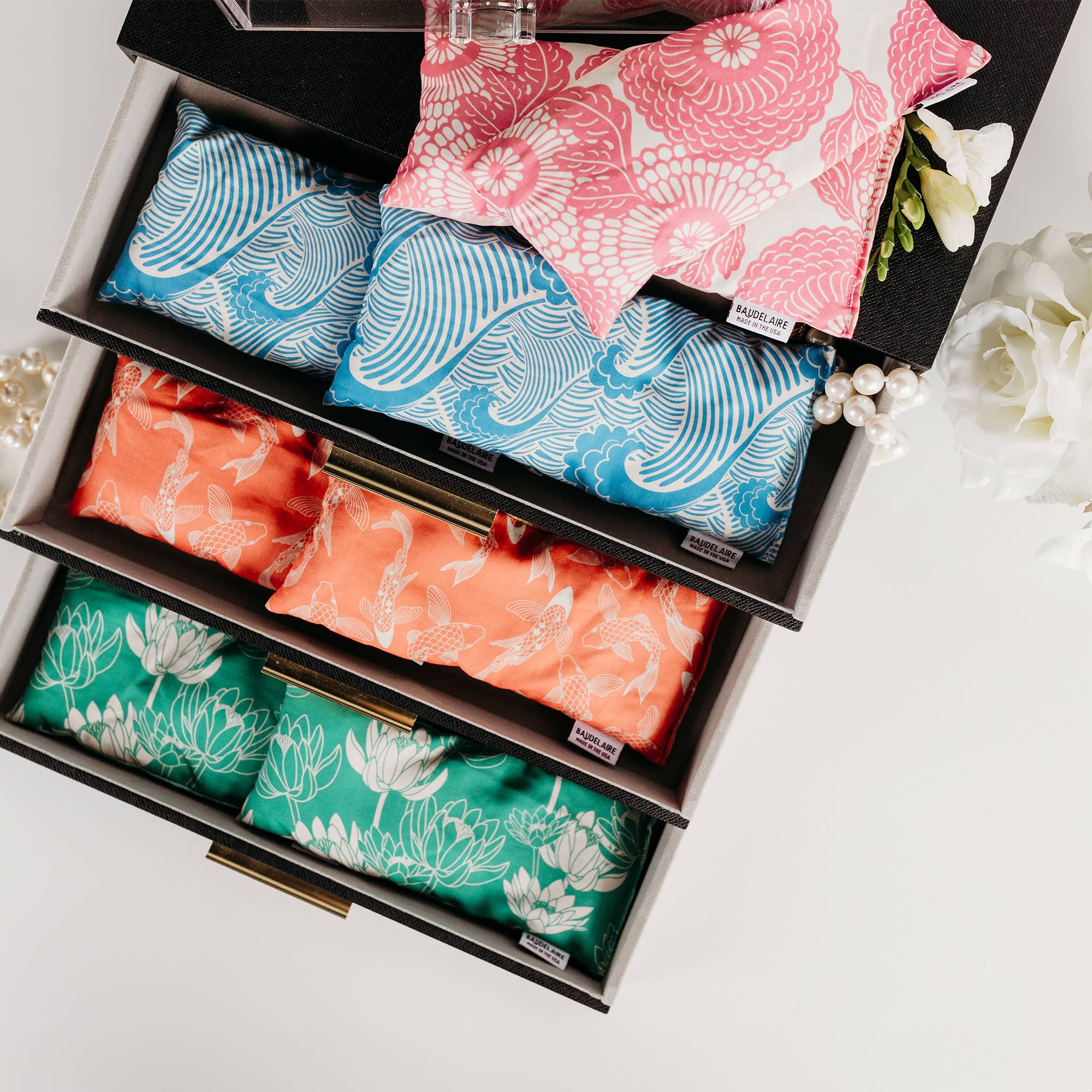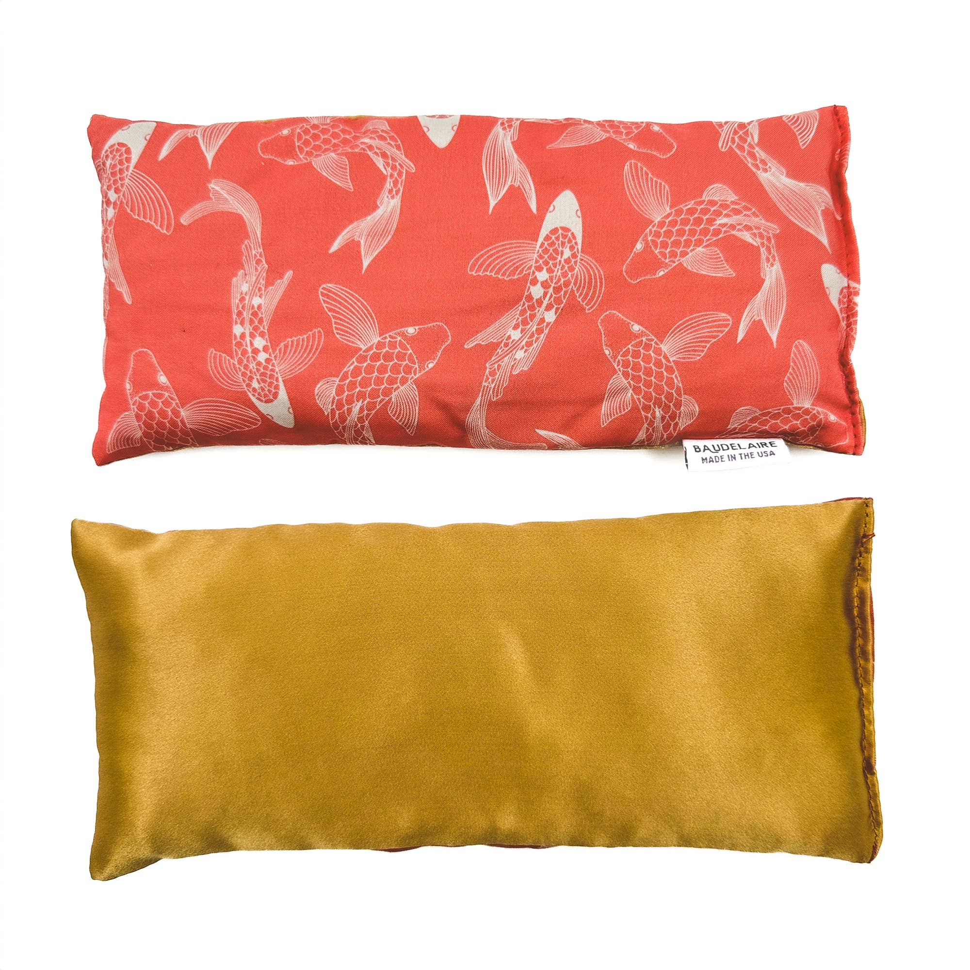Artisan-made in the USA, these beautifully printed eye pillows are covered in 100% cotton on one side and cooling, natural silk on the other. Filled with fragrant French lavender and hearty flax seeds for a soothing scent and relaxing, weighted feel.