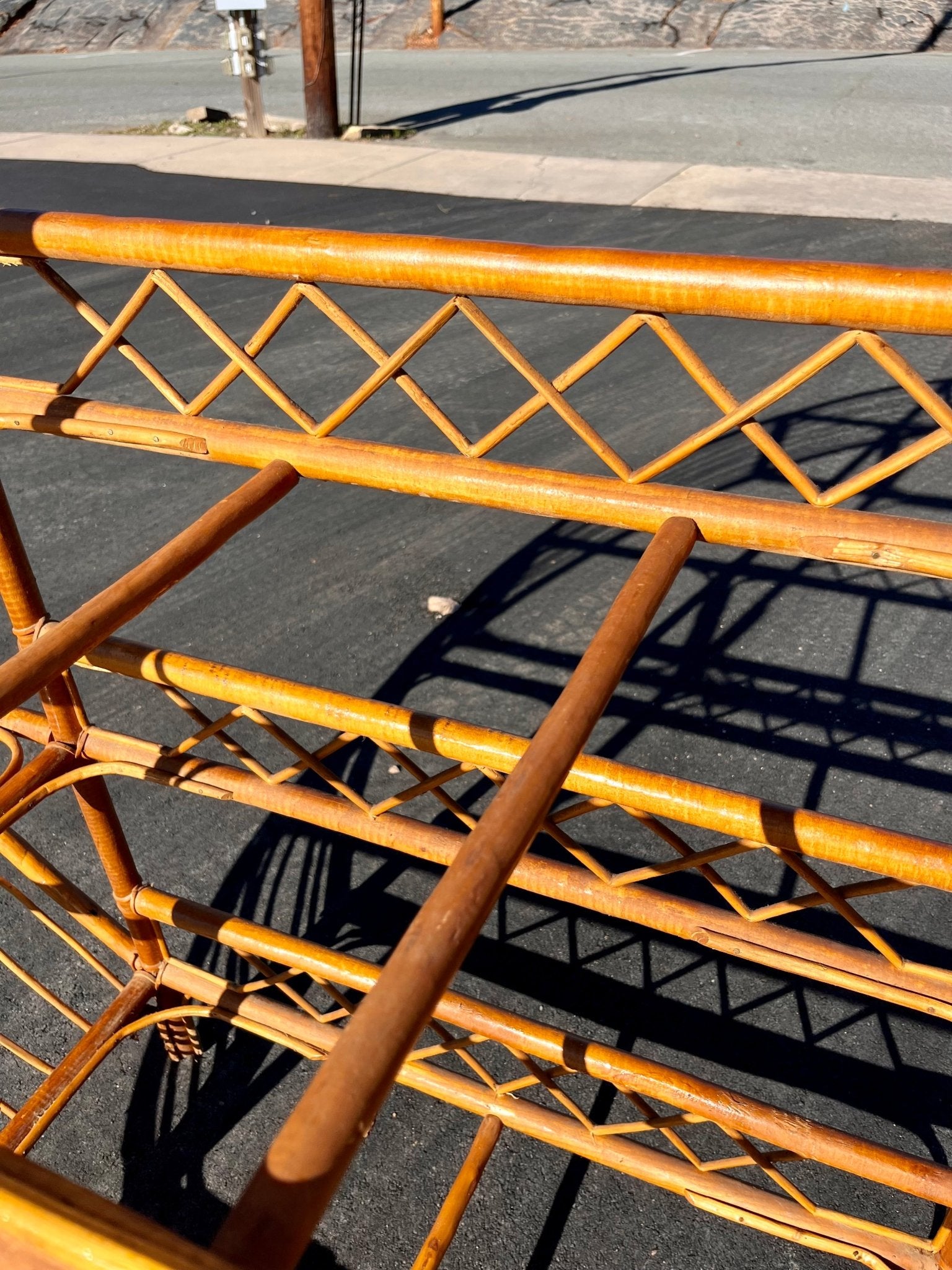 Rare crossed detailing adds a unique touch, while the rattan wrapping offers durability. Featuring glass shelving, it is both functional and stylish.
