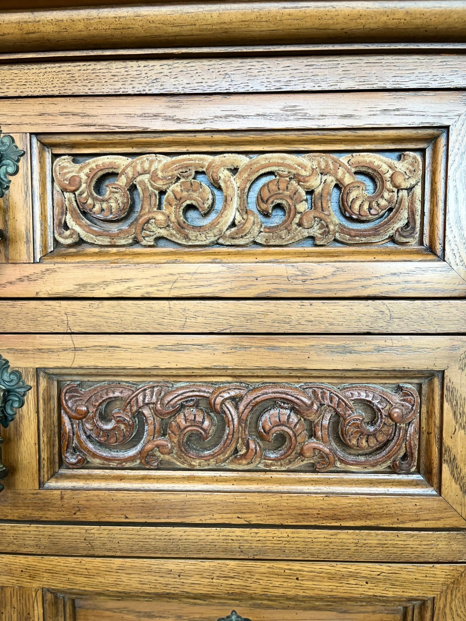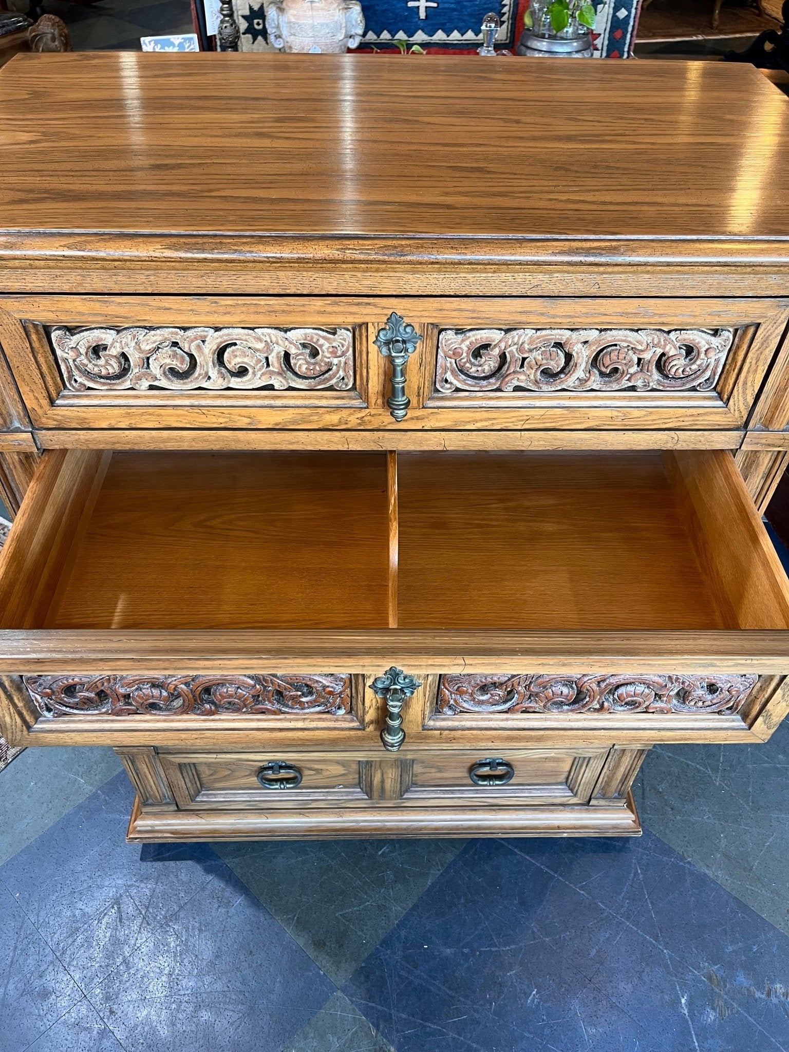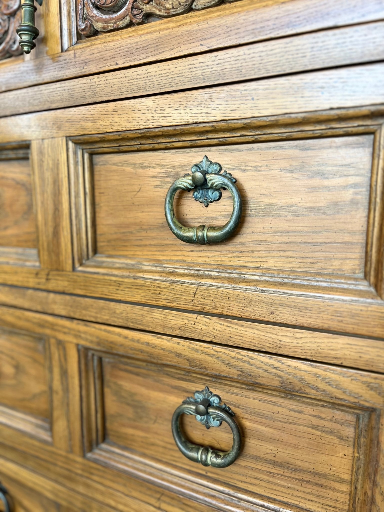 We are obsessed with this piece! The large vintage brass handles are definitely substantial a focal point. Made from solid wood, the details on this piece are incredible! The first two drawers have carved wood detailing, with organization cubbies on the inside.
