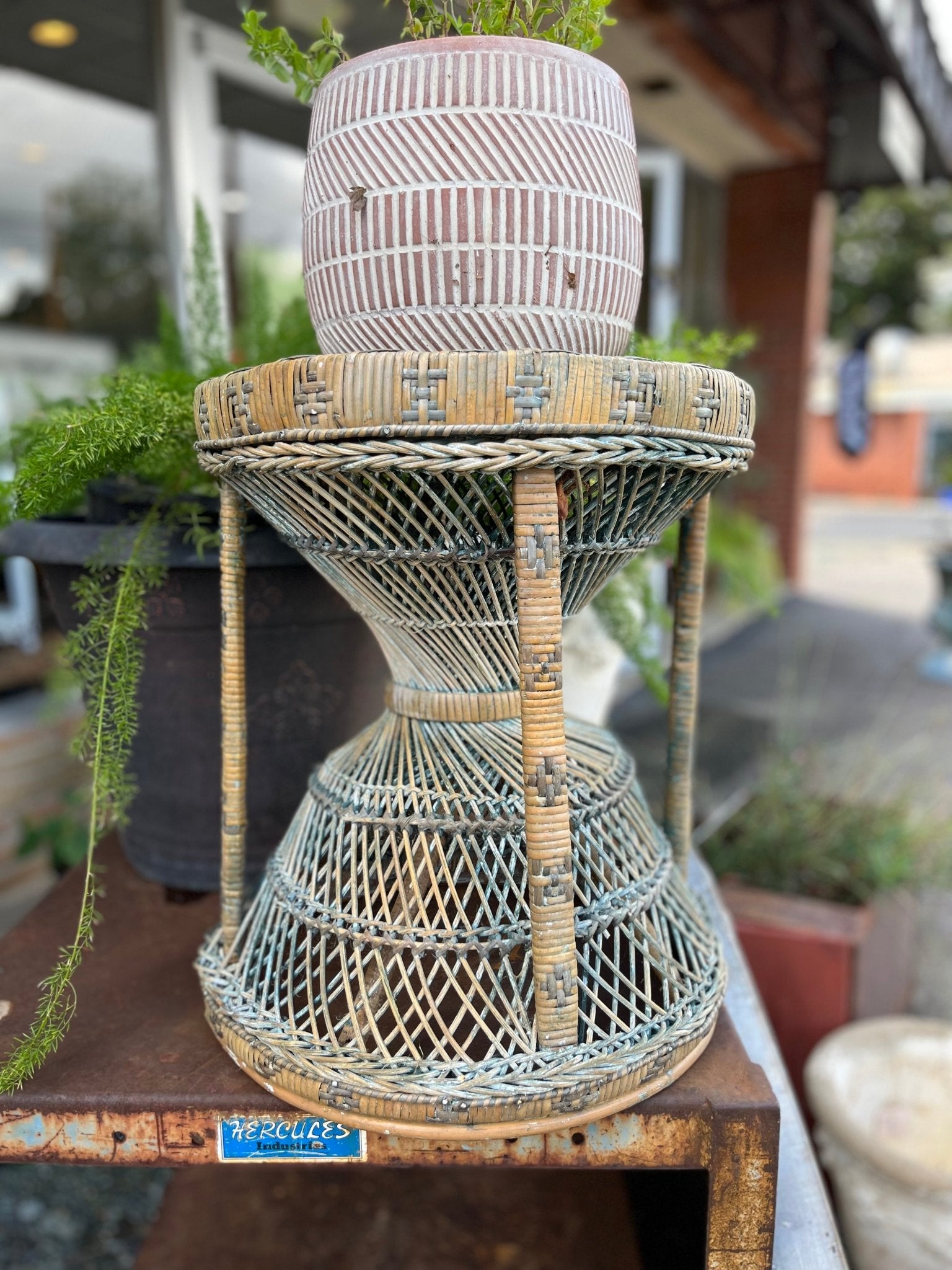 This unique Vintage Wicker Spindle Plant Stand/Stool boasts a cute aged wicker design and is accented with painted western style pillars, making it a standout addition to any space.