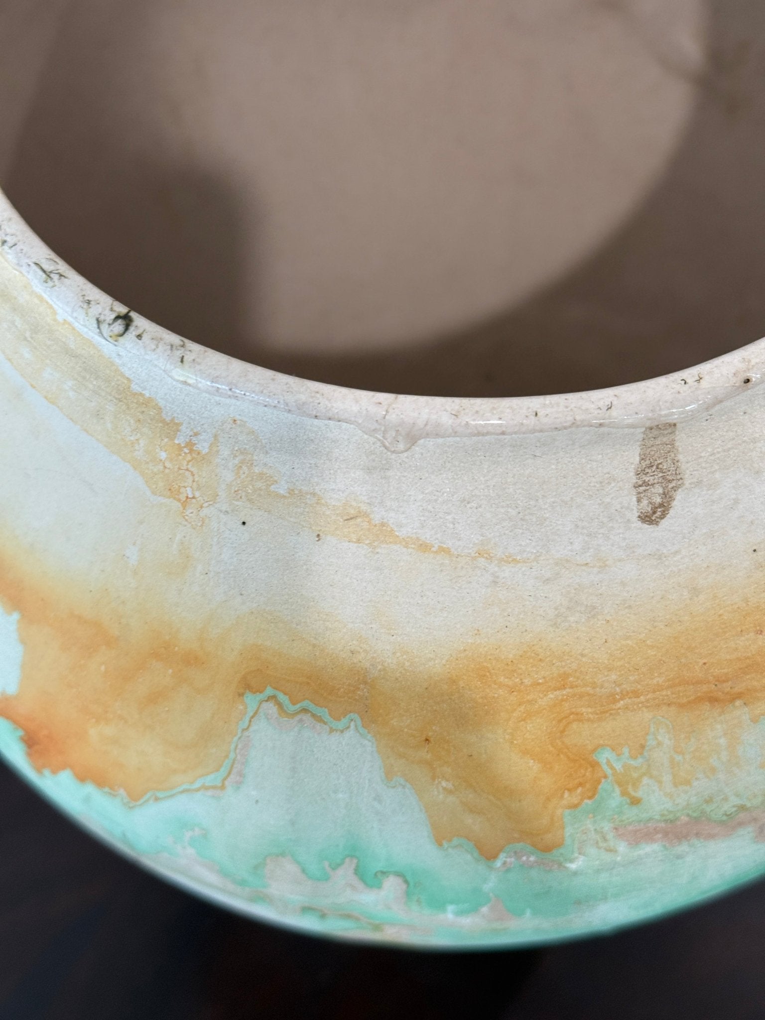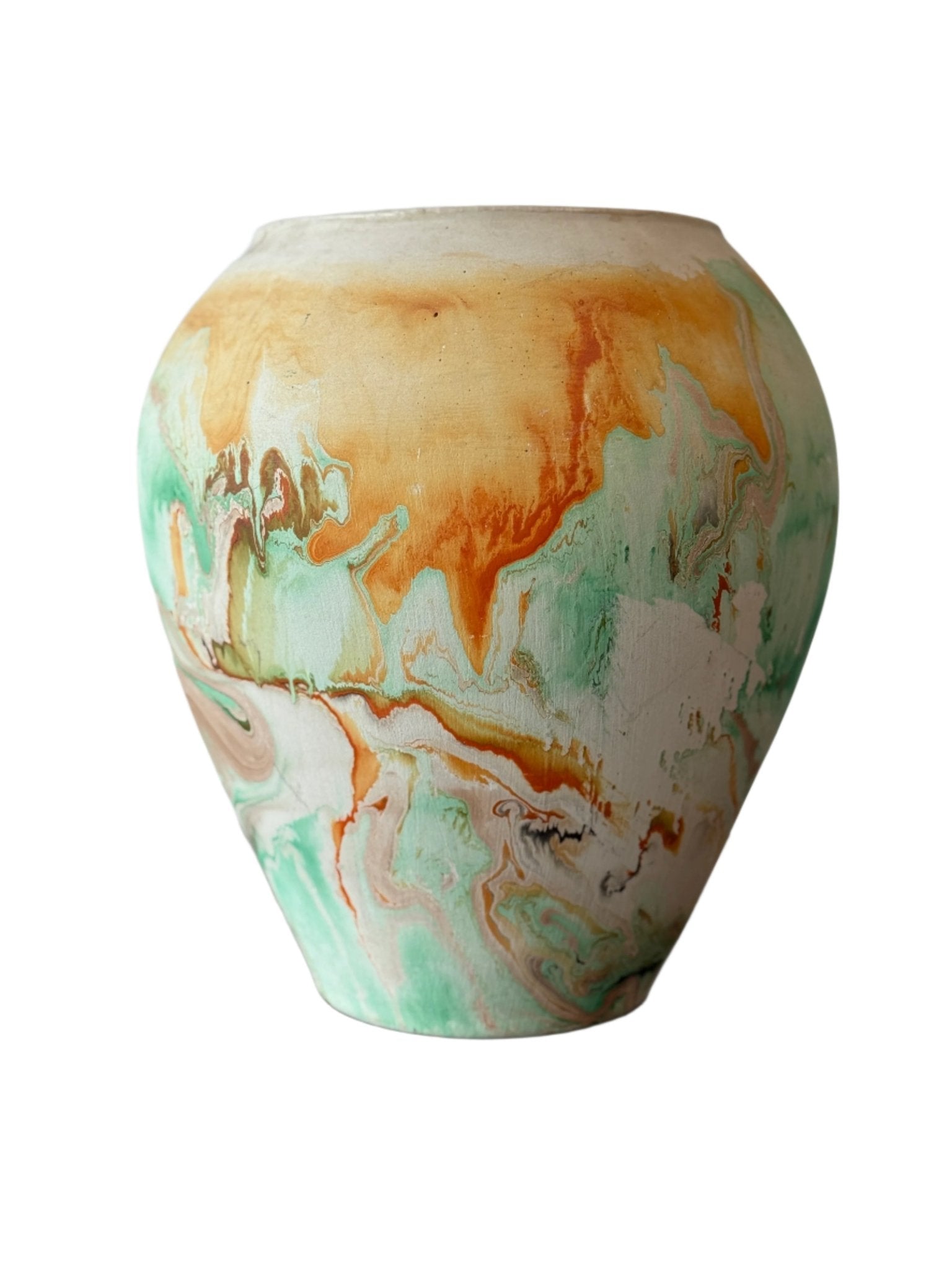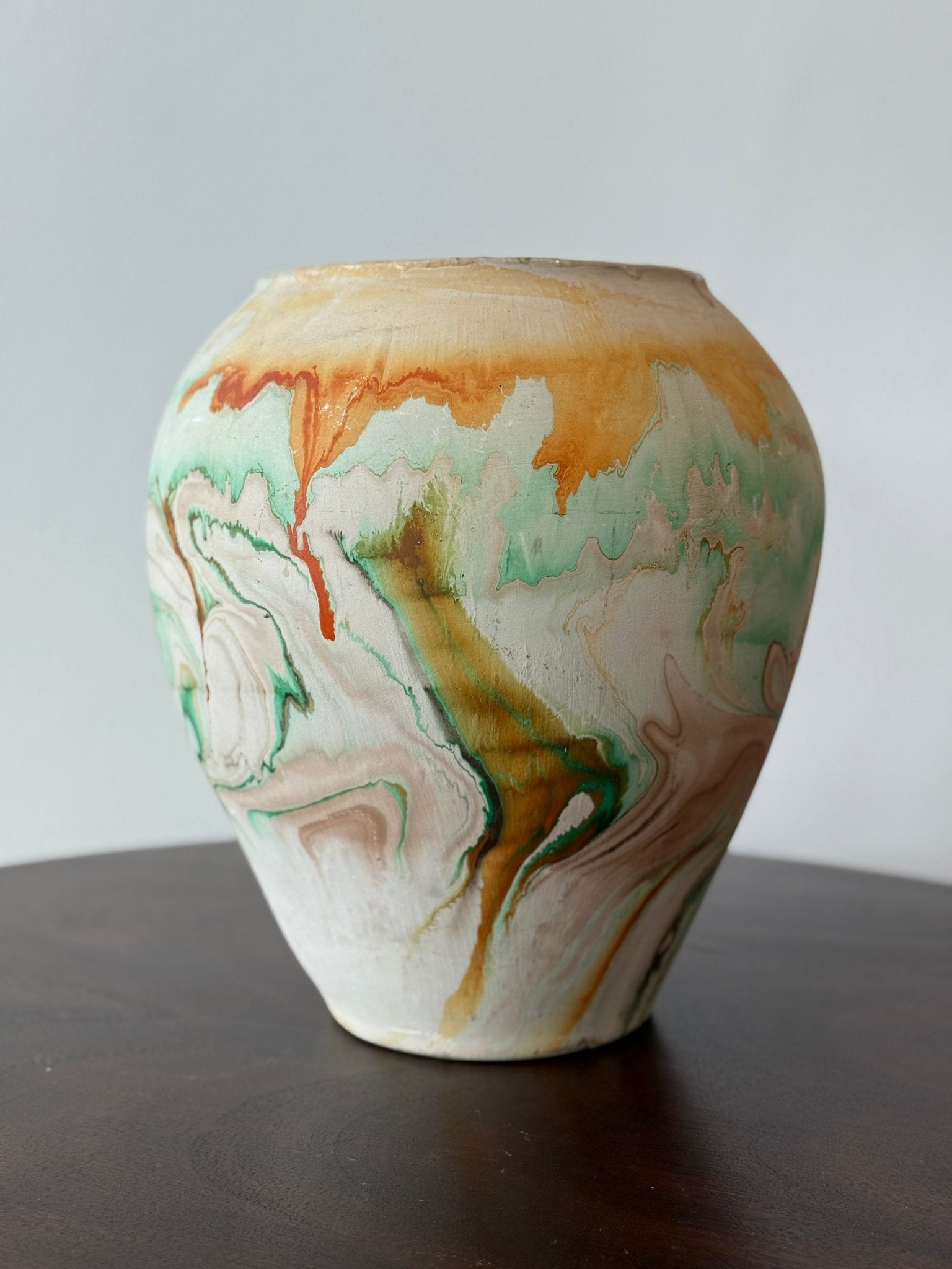 This beautiful vase boasts bright greens, oranges and browns