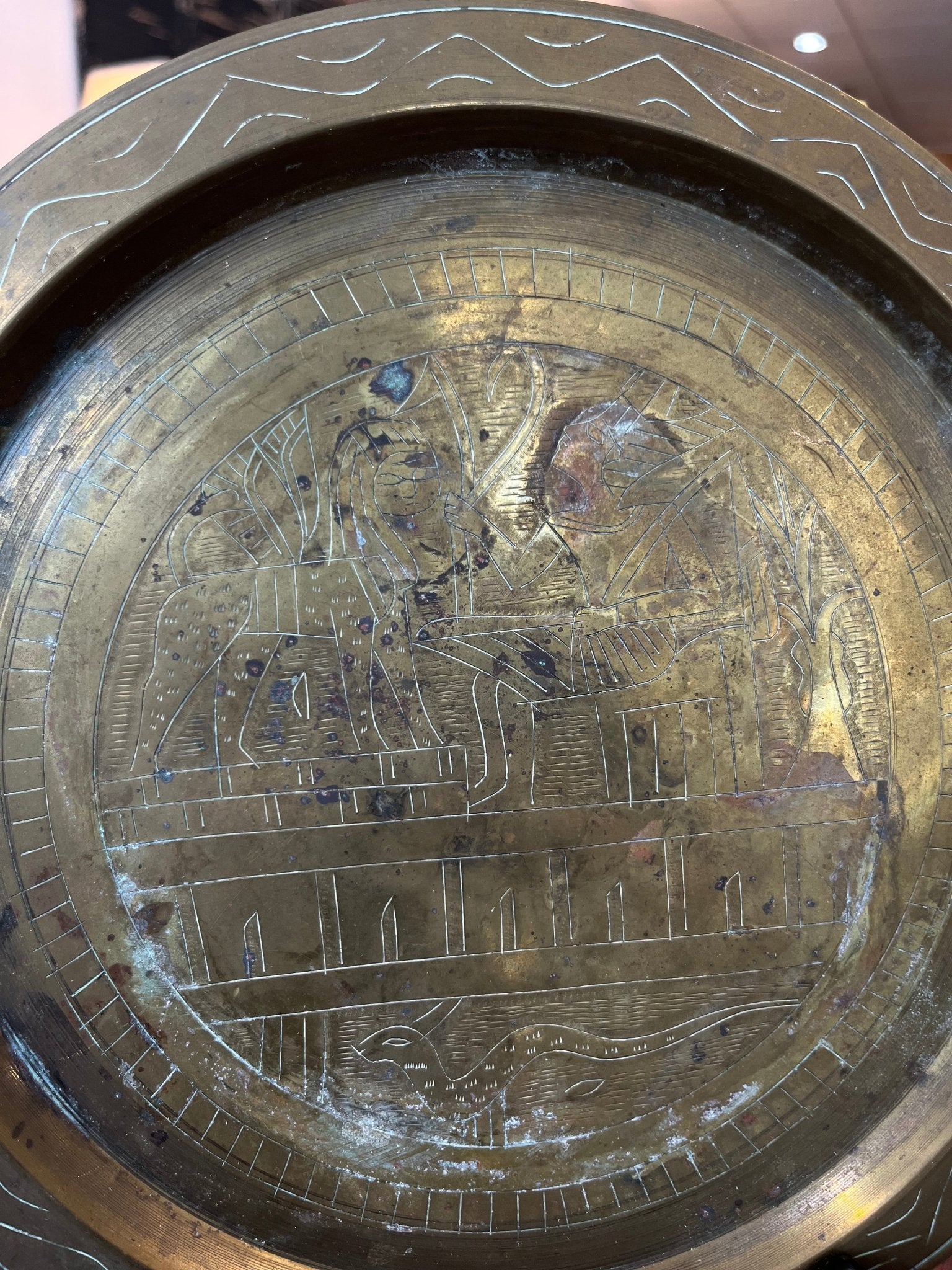 This very old looking brass tray is engraved with an Egyptian scene, including a Pharos, a snake, sphinx, and lots of Egyptian style geometry accents!
