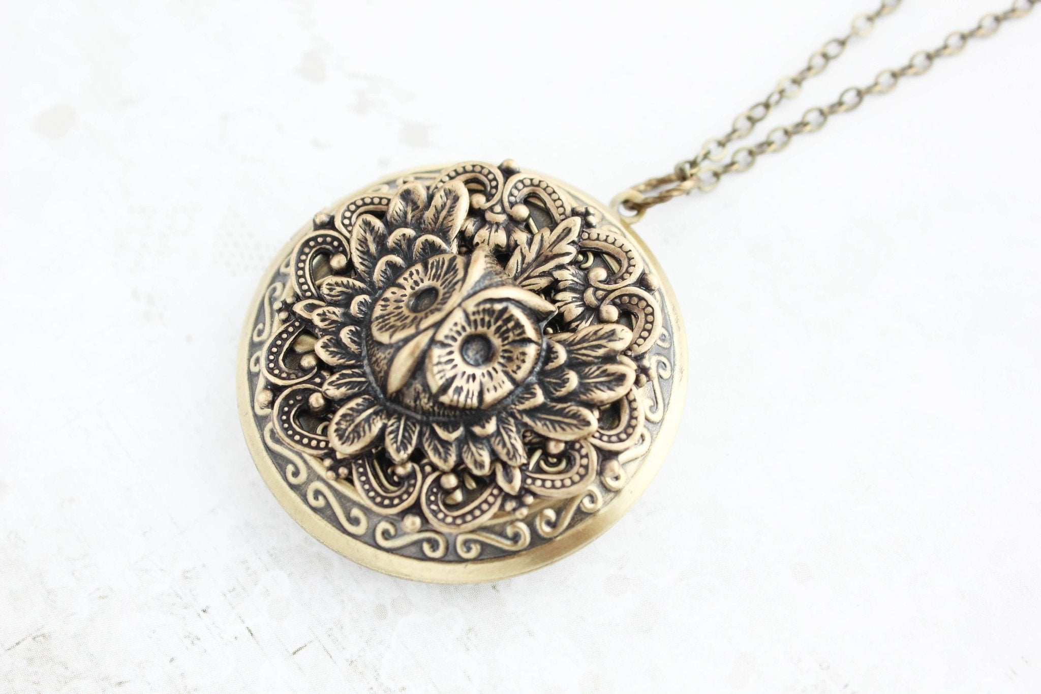 This is a large round locket necklace with layers of antiqued gold brass lace filigree layers on an antiqued brass locket!