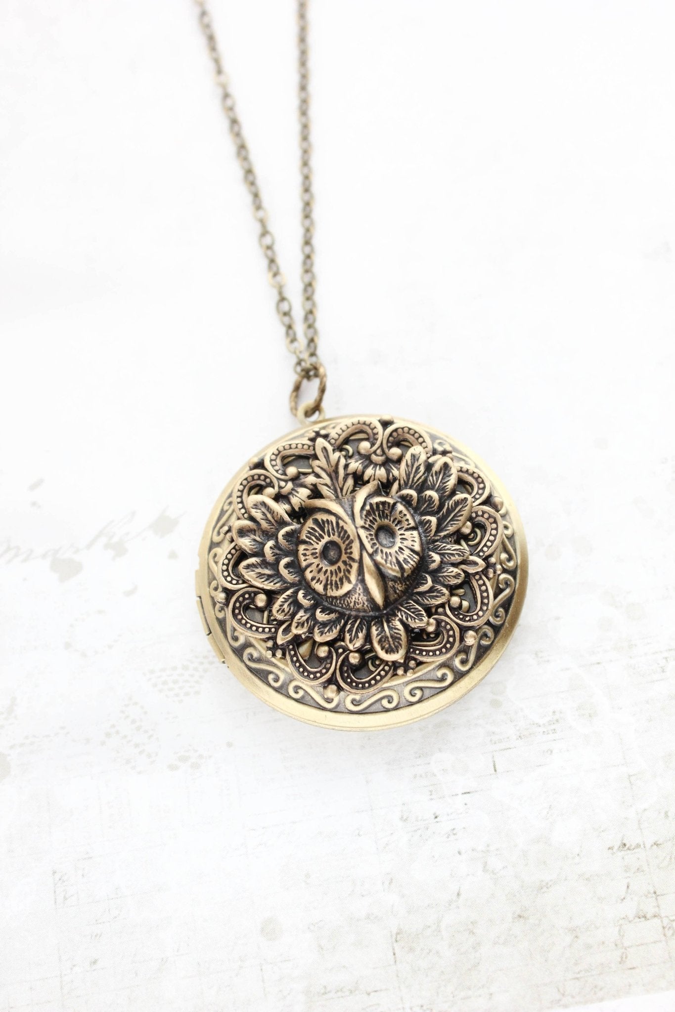 A Pocket of Posies - Owl Locket Necklace - Antiqued Gold Brass: 20 inches