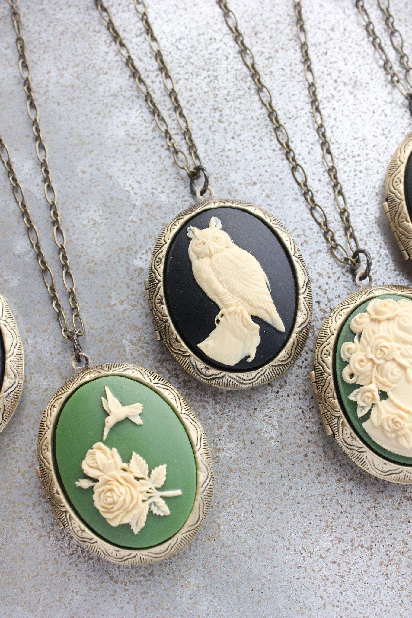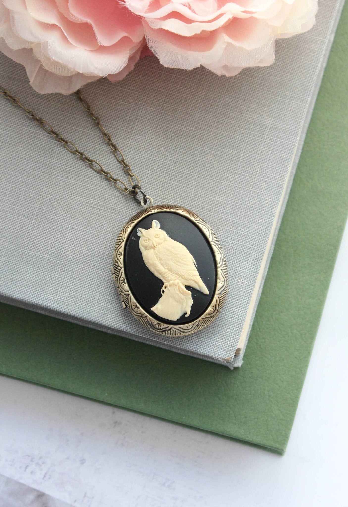 The focal on the front of the locket is a resin cameo with an ivory cream owl on a black background.