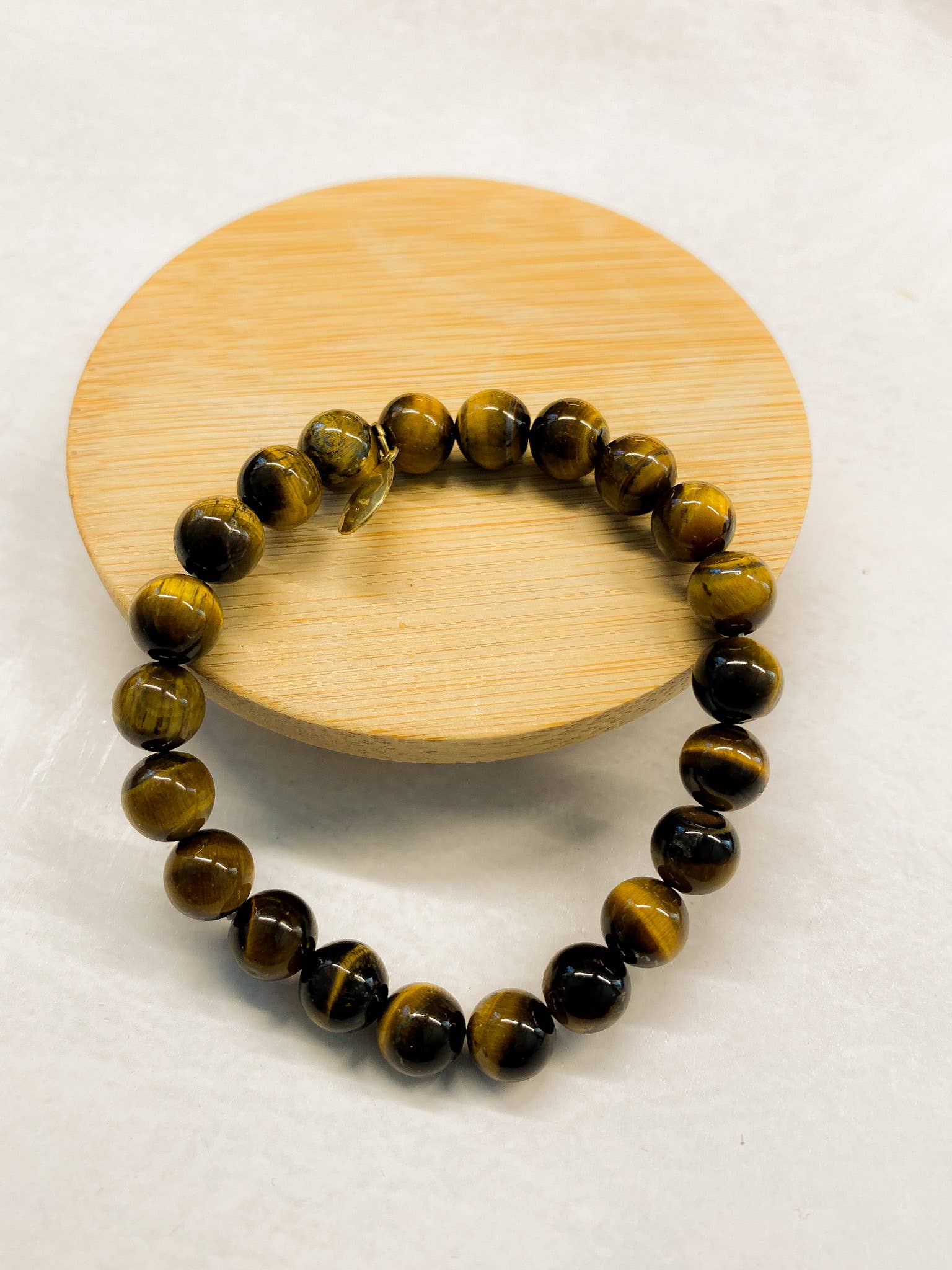 Smooth Tiger Eye beaded bracelet with a leaf shape tiny brass charm detail. Beads are approx 8mm. Women's sizing.