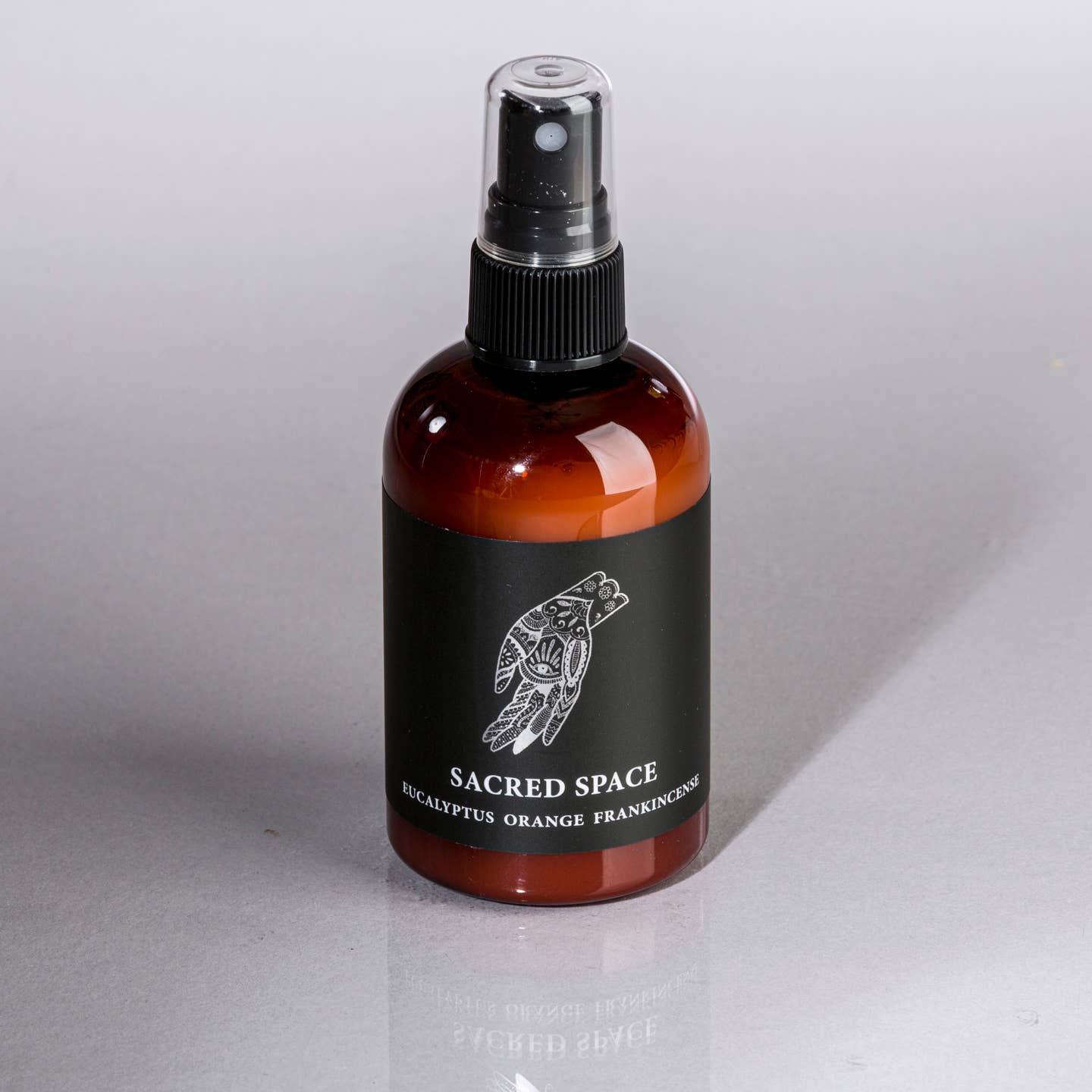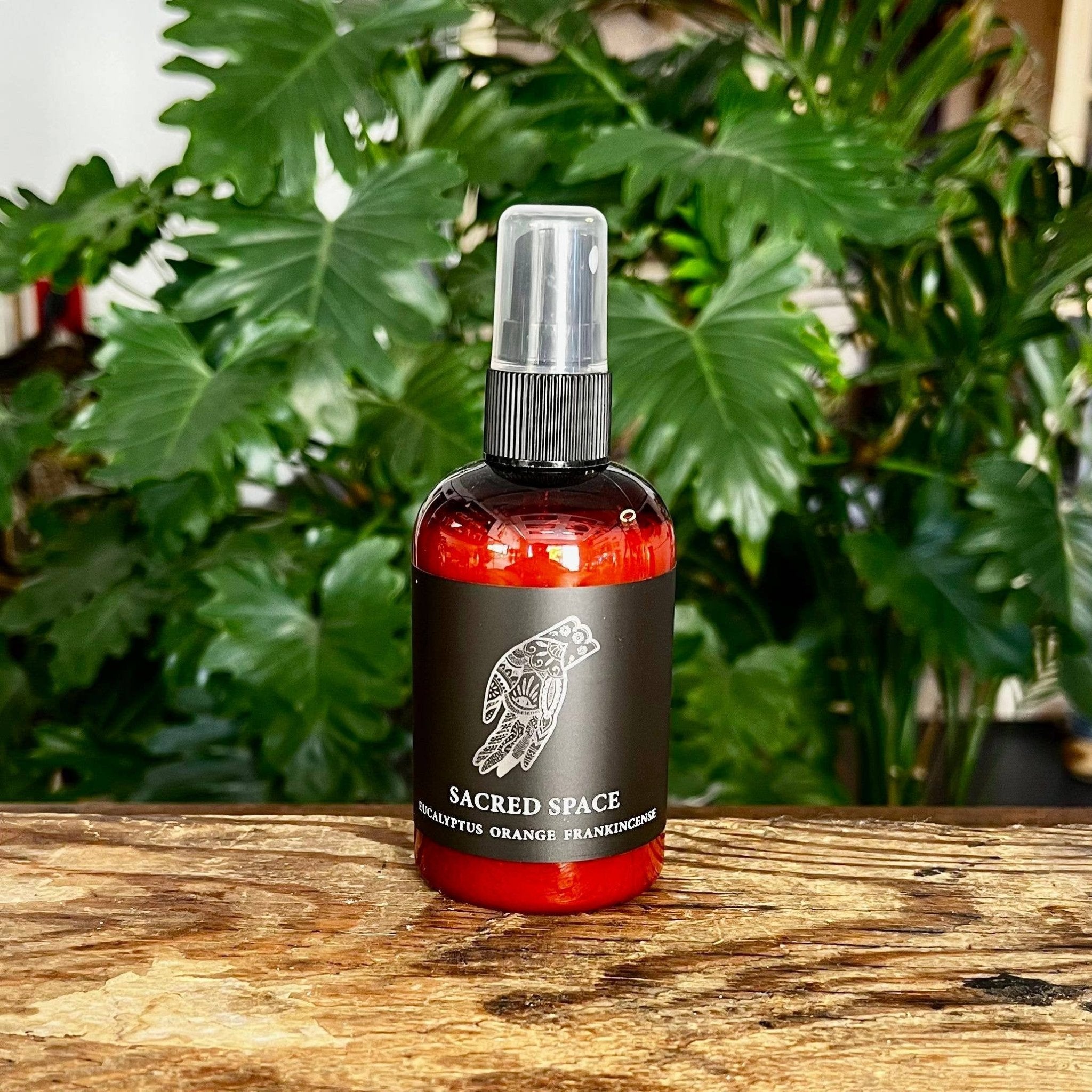 Body & Room Mist: Water, witch hazel, organic vegetable glycerine, organic essential oils: Orange, Eucalyptus & Frankincense, encasing a crystal charged under the full moon.