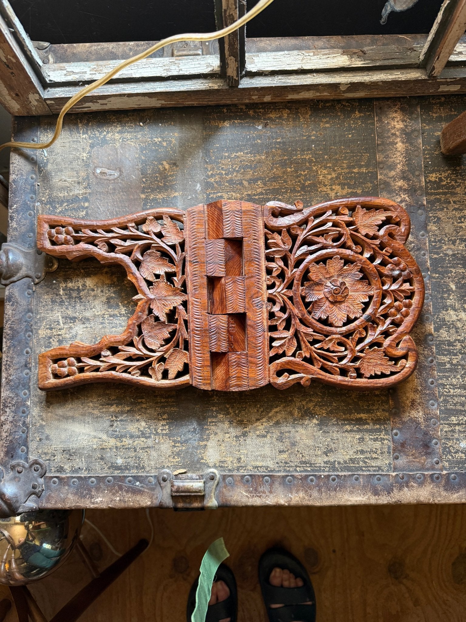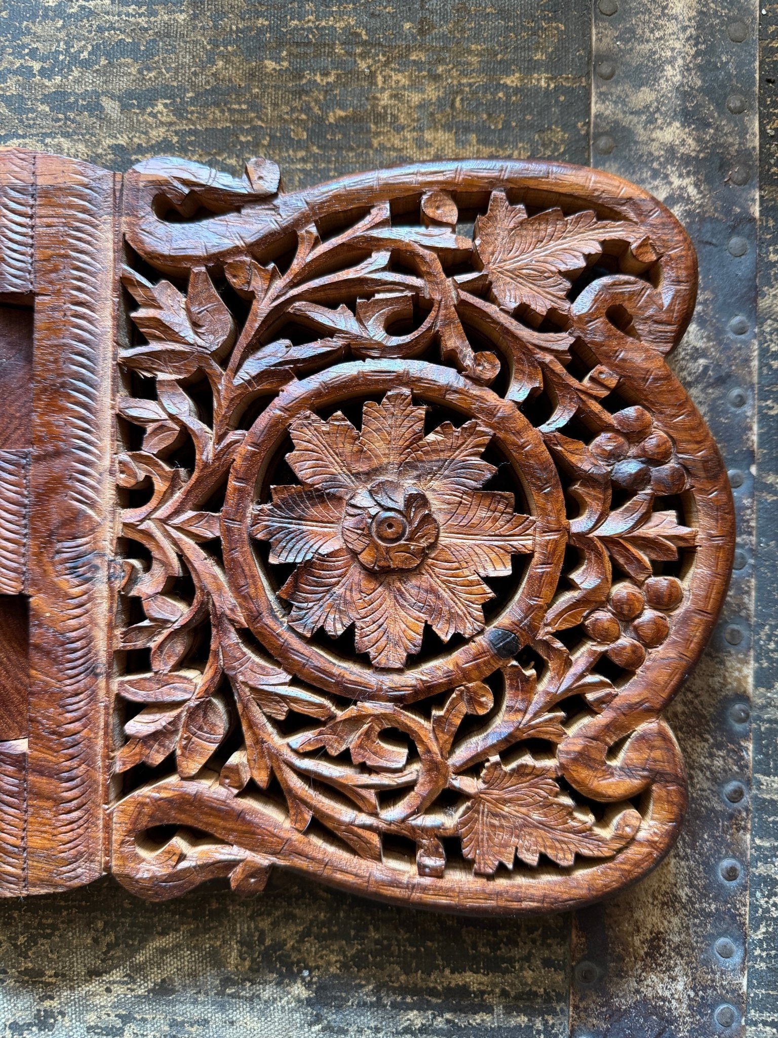 This hand crafted solid wood vintage beauty has a warm patina and floral and vine carvings throughout.