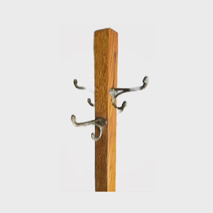 Crafted from sturdy oak with a warm golden finish, this piece showcases beautiful natural grain and a simple, classic silhouette. The four curved feet provide excellent stability, while the metal hooks near the top are perfect for hanging coats, hats, scarves, or bags.