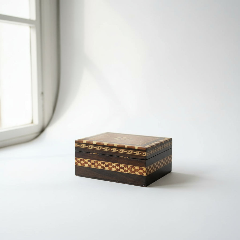 This vintage Spain inlaid mosaic box is perfect for holding a few small treasures or jewelry.