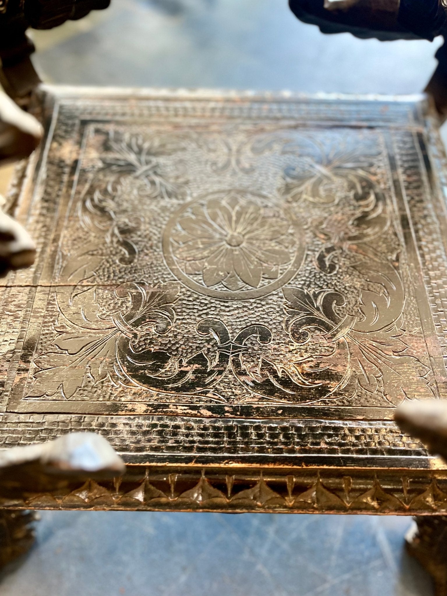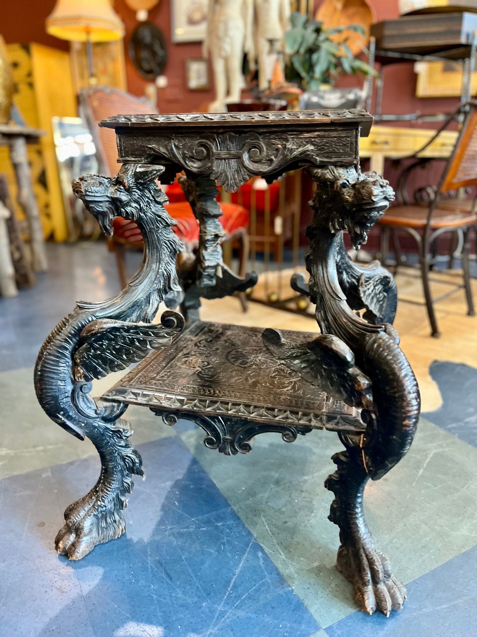 Exquisitely detailed dragon legs and hand carved detail on every surface; this piece is sure to catch the eye. Its unique design, impressive condition, and versatility as a plant stand or side table make it a stylish and bold addition to any room.