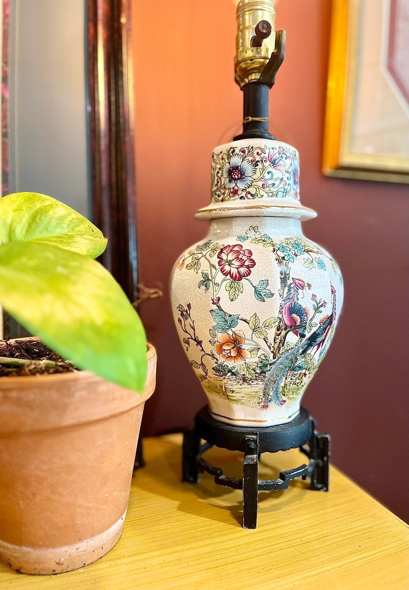 Featuring beautiful flowers and birds, intricate gold details, and a unique black pedestal base. This small lamp adds a touch of quirky charm to any room.