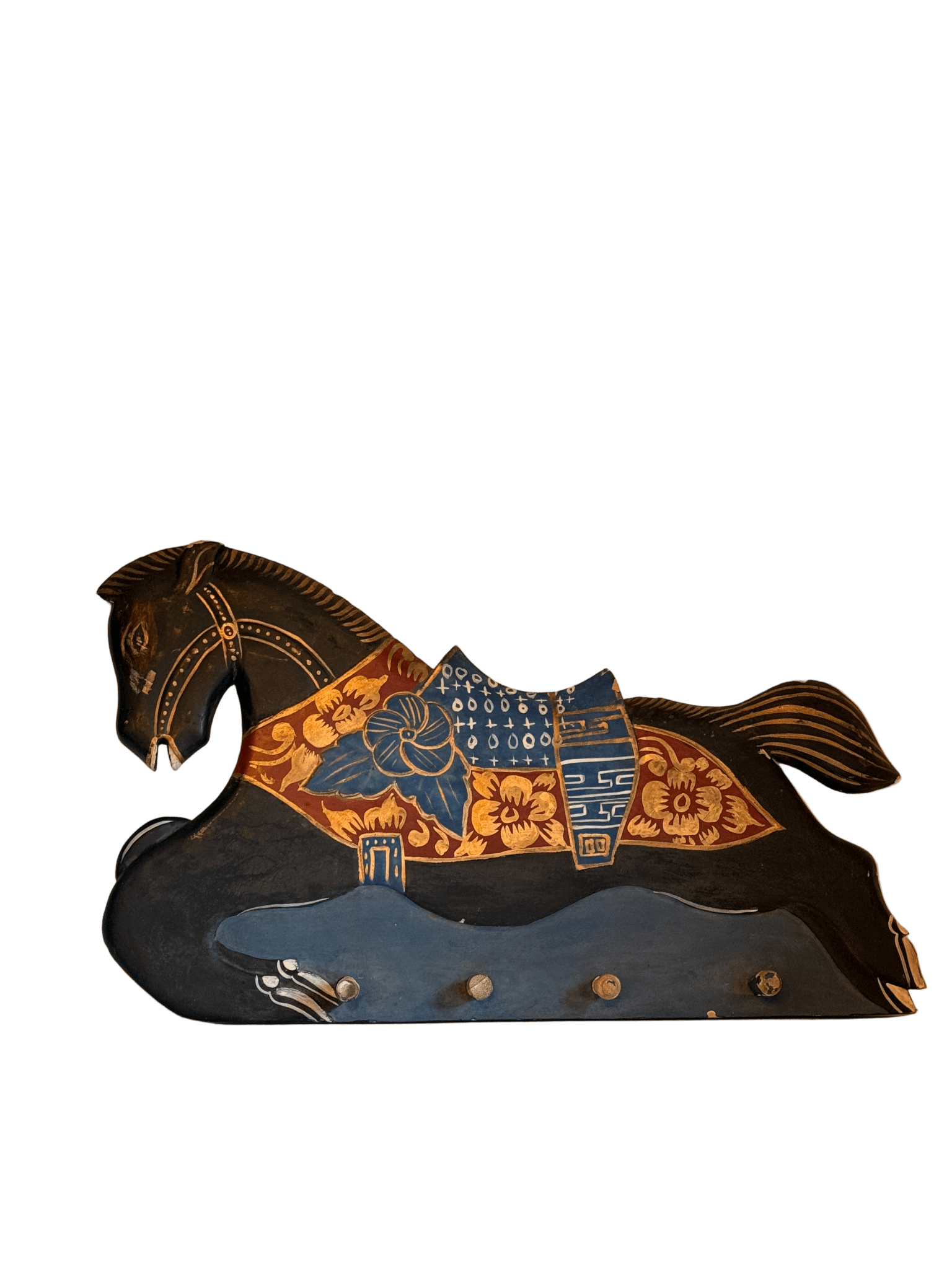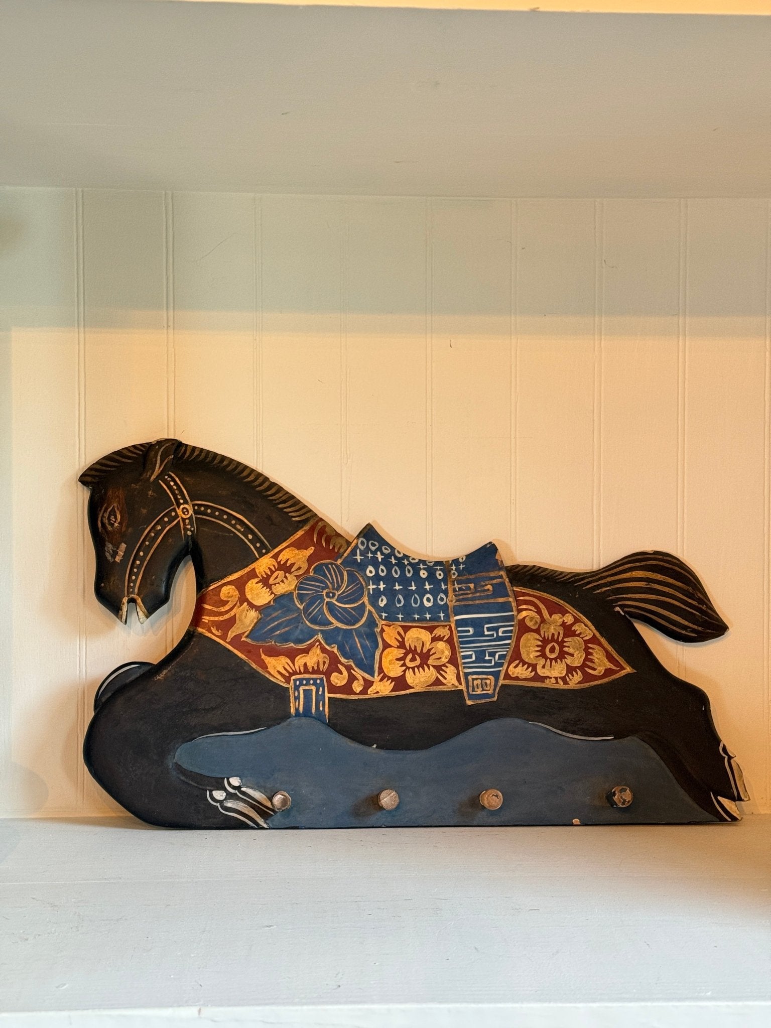 This is a hand-painted wooden horse coat rack. This piece is painted in a folk art style. Colors of black and navy with gold and rust give it a Scandinavian inspired look.